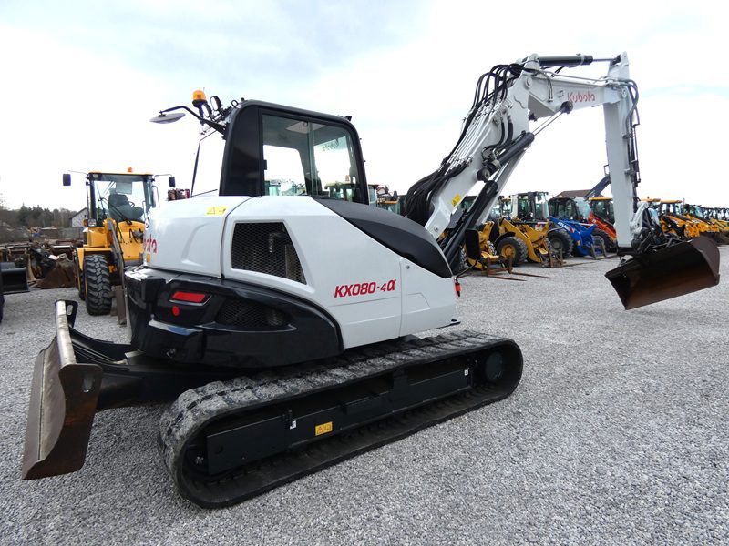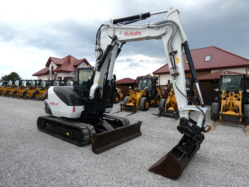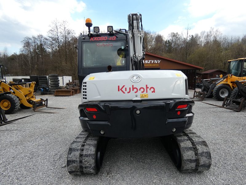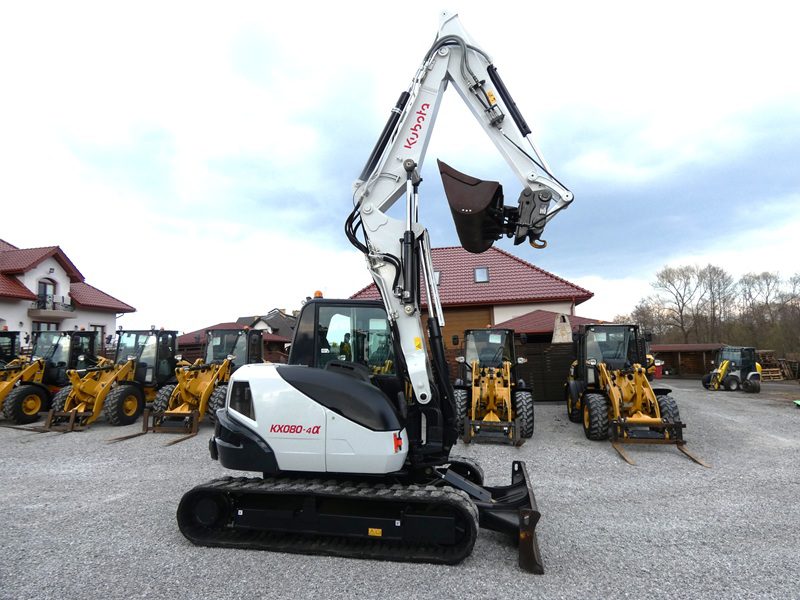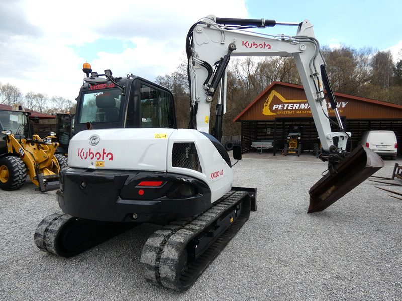 Minikoparka KUBOTA KX080-4&, rok prod. 2017, nowszy model, maszyna sprowadzona z Niemiec, nie pracowała w Kraju, org. przebieg tylko 4.823 MTG., wpisujemy na fv, oryginalny lakier na całej maszynie, oprócz obciążnika i podwozia po bokach, bardzo ładnie utrzymana i zadbana, szybkozłącze Lehnoff MS08 + łyżka skarpowa hydrauliczna, podwozie dobre, tylko gąsienice słabe ( możliwość założenia nowych w cenie ) Klimatyzacja, pompka paliwa, ramie 3 x łamane + skrętne przy kabinie, silnik hydraulika jazda w super stanie, bardzo ładnie wszystko pracuje, jest sztywna nie wybita, bez wycieków, stan techniczny i wizualny bardzo dobry !